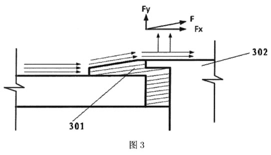 通過液體介質(zhì)流過由保護(hù)套301形成的坡面進(jìn)行導(dǎo)流,可以產(chǎn)生一個與坡面平行的力F,這個力可以分解為水平方向的力Fx和垂直方向的力Fy,與液體介質(zhì)的流向垂直的力Fy可以減少電極頭302表面所承受的壓力,從而減少電極頭的磨損。坡面的傾斜角越大,垂直向上的力Fy也越大。但是,應(yīng)該注意,坡面的傾斜角不能設(shè)置的過大,以免產(chǎn)生擾流,即,坡面的傾斜角的設(shè)置不要對液體介質(zhì)的流速產(chǎn)生影響。通常,為了確保坡面的傾斜角度,保護(hù)套的頂部不高于電極頭的頂部。