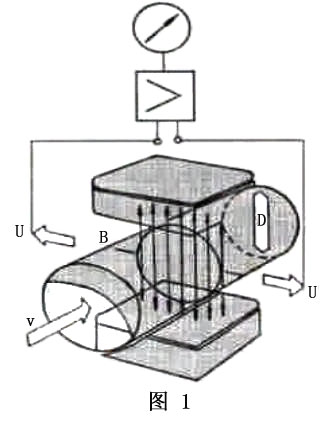 如圖1所示,在一內(nèi)徑為D,內(nèi)部磁場強度為B的非導(dǎo)磁性測量管內(nèi),液態(tài)的具有導(dǎo)電性被測介質(zhì)以v的速度流動,則在與流動方向垂直的方向上產(chǎn)生與流量成比例的感應(yīng)電勢U,該電勢的大小如下