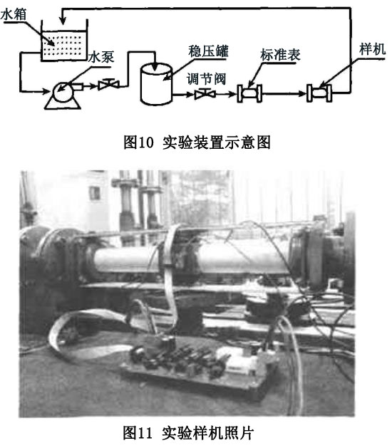 利用試制完成的原理樣機(jī),在試驗(yàn)裝置上以水為測量介質(zhì),使用某型號普通接觸式電磁流量計作為參考表進(jìn)行對比試驗(yàn),該表精度等級為0.5級,測量范圍為1.3~16m³/h,實(shí)驗(yàn)管徑為40mm,對應(yīng)流速范圍為0.3~3.5m/s,實(shí)驗(yàn)裝置如圖10所示。圖11是實(shí)驗(yàn)樣機(jī)照片。