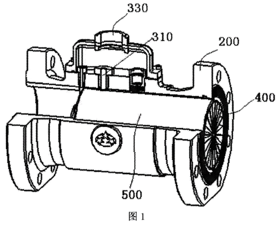 在表體300的體壁上和磁屏蔽套500的套壁上開設(shè)有對(duì)應(yīng)的傳感器穿過孔310、510,將傳感器200穿過表體300的體壁上和磁屏蔽套500的套壁上的傳感器穿過孔310、510,隨后將智能積算儀100通過安裝孔330安裝在表體300上,使傳感器310的內(nèi)端與盤信號(hào)900連接,而外端與智能積算儀100信號(hào)連接。