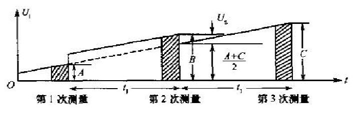 (a)方波磁場的感應(yīng)強(qiáng)度(理想情況), (b)由電扳2個電壓Ue的測量值差得出有用電壓Uu.。 當(dāng)溫度或被測介質(zhì)的化學(xué)關(guān)系發(fā)生變化時,電化學(xué)干擾電壓不再保持恒定,而是以一定的時間間隅(幾秒到幾分)變化。因?yàn)榧兓瘜W(xué)直流干擾電壓變化的時間遠(yuǎn)大于測量周期的時間,所以在此間隔中這種變化可近似看做與時間呈線性關(guān)系的變化。這樣,在測量時采用簡單的線性插補(bǔ)方法可使電化學(xué)干擾電壓的變化和由此所引起的誤差(見圖3.8)得到抑制。為了達(dá)到此目的,在磁場關(guān)斷時測得第1個值是電化學(xué)直流干擾電壓(A值);然后接通磁場;當(dāng)磁場感應(yīng)強(qiáng)度達(dá)到*大值之后,測得的第2個值是平均變化的電化學(xué)直流干擾電壓和有用信號疊加值(B值)。當(dāng)磁場再次關(guān)斷時,量測的第3個值是經(jīng)間隔時同后上升的電化學(xué)直流干擾電壓(c值)。2個不同的電化學(xué)直流干擾電壓(A值和c值)的平均值與B值的疊加信號相減便獲得有用的電壓信號值Ub。
