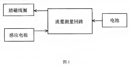 根據(jù)圖1,本實(shí)用新型包括流量測(cè)量回路,與流量測(cè)量回路分別相連的勵(lì)磁線圈感應(yīng)電極、電池。將傳統(tǒng)流量計(jì)預(yù)留給外部電源的接口直接與流量計(jì)的內(nèi)置電池組相連,由電池組提供流量計(jì)內(nèi)部的流量測(cè)量回路的工作電源。流量測(cè)量回路給勵(lì)磁線圈通電產(chǎn)生磁場(chǎng),感應(yīng)電極用來測(cè)量流體通過產(chǎn)生的感應(yīng)電動(dòng)勢(shì),并將檢測(cè)到的電動(dòng)勢(shì)信號(hào)傳遞給給流量測(cè)量回路,流量測(cè)量回路對(duì)此信號(hào)進(jìn)行分析處理得到流量信號(hào),并可通過顯示屏顯示數(shù)本實(shí)用新型安裝在測(cè)量管道上,流體需保證滿管。流量測(cè)量回路以1/15赫茲的頻率給勵(lì)磁線圈通電,勵(lì)磁線圈得電,產(chǎn)生磁場(chǎng),流體通過切割磁感線產(chǎn)生感應(yīng)電動(dòng)勢(shì),感應(yīng)電極感應(yīng)該電動(dòng)勢(shì)的大小并將信號(hào)傳遞給流量測(cè)量回路,流量測(cè)量回路對(duì)該信號(hào)進(jìn)行處理后得到流量信號(hào)并顯示。