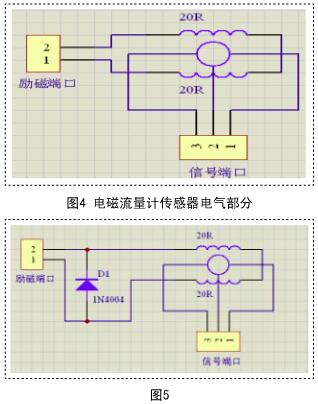 電磁流量計(jì)傳感器勵磁電流是產(chǎn)生電火花的危險(xiǎn)源,電磁流量計(jì)要用于井下,首先得勵磁電路達(dá)到本質(zhì)安全要求。電磁流量計(jì)傳感器電氣部分由2個線圈組成,如圖4。