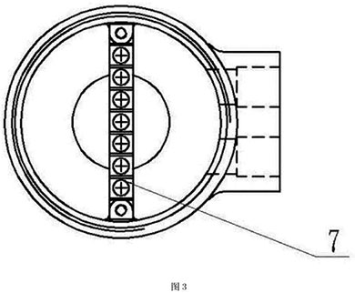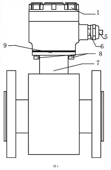 本實(shí)施例如圖4所示,分體接線盒用4只M6的螺釘8將殼體3與固定在流量傳感器7上端,殼體3與傳感器7之間采用橡膠密封墊9密封。端子排7用兩個(gè)M4的螺釘固定在殼體內(nèi),接線端子通過連接電纜5,穿過安裝在殼體上的格蘭頭6連接到變送器。分體蓋l通過螺紋擰緊在殼體3的上端,分體蓋1與殼體3的密封采用O型圈密封。使用時(shí)電纜與管道軸線方向一致,管道為垂直方向時(shí),電纜出線方向朝下,從而不會(huì)造成外部的液體流