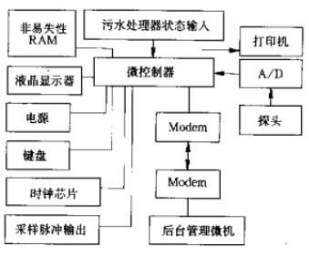 該系統(tǒng)的硬件組成如圖1所示。微控制器采用89C52;探頭選用壓力式探頭,可克服超聲波式探頭易受污水中泡沫干擾的弊病;A/D轉(zhuǎn)換器選用AD1674;時(shí)鐘芯片選用DS1302;液晶顯示器為點(diǎn)陣式的MGLS19264,可顯示四行漢字;非易失性RAM選用DS1230;打印機(jī)為普通微型打印機(jī);采樣脈沖輸岀端口用來輸出采樣脈沖,控制采樣器采樣污水;污水處理器狀態(tài)輸入端口可輸入污水處理器的通斷時(shí)間,供遠(yuǎn)程監(jiān)控作用
