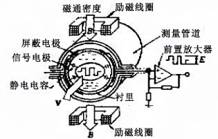 無電極式電磁流量計(jì)原理如圖所示。當(dāng)導(dǎo)電性液流過與流動(dòng)方向垂直的磁場(chǎng)(測(cè)量管道)時(shí),根據(jù)法拉第電磁感應(yīng)定律,就會(huì)產(chǎn)生與平均流速成正比的感應(yīng)電動(dòng)勢(shì)E。這一電動(dòng)勢(shì)用一對(duì)信號(hào)電極檢測(cè),該電極放置在(不接觸流體,稱無電極)與流動(dòng)方向及磁場(chǎng)方向垂直的測(cè)量管村里外壁上測(cè)得們流量信號(hào)經(jīng)轉(zhuǎn)換放大后,即作為流體的體積流量這個(gè)電動(dòng)勢(shì)用下式表示,即與平均流速成正比: