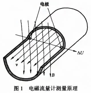 電磁流量計測量原理如圖1所示,管道內(nèi)流動的導電液體切割磁力線,將在兩端電極間產(chǎn)生電勢差ΔU,ΔU與磁通量密度B、液體流速ν符合弗來明右手定則。只要管道內(nèi)部流場理想、磁場穩(wěn)定,△U的大小與管道內(nèi)介質(zhì)平均流速成嚴格的線性關系,從而通過測量ΔU的大小可確定管道內(nèi)介質(zhì)流量。