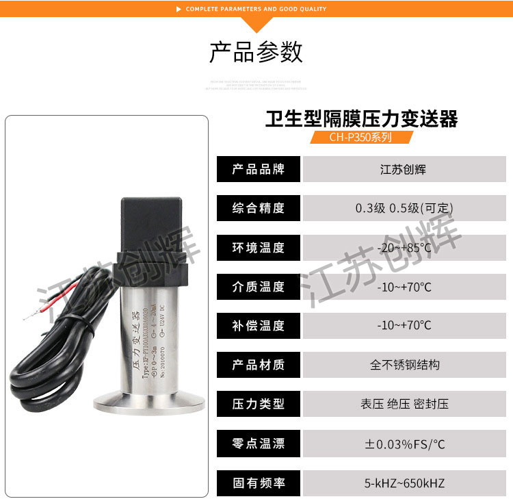 CH-2088W衛(wèi)生隔膜壓力變送器是專門為醫(yī)藥、啤酒、奶倉(cāng)等醫(yī)藥食品領(lǐng)域設(shè)計(jì)的專用型產(chǎn)品,該系列采用E+H**技術(shù),其設(shè)計(jì)完全遵照醫(yī)藥食品行業(yè)的衛(wèi)生級(jí)標(biāo)準(zhǔn)。利用齊平大波紋片使測(cè)量介質(zhì)與壓力傳感器相隔離,其間灌充衛(wèi)生及專用油,可保證在介質(zhì)溫度150℃的高溫下無溫漂的穩(wěn)定工作。客服了目前工業(yè)現(xiàn)場(chǎng)上常用齊平式擴(kuò)散硅或陶瓷電容變送器因傳感器直接接觸介質(zhì),從而在高溫情況下溫漂大,導(dǎo)致超差,尤尤其是滅菌環(huán)境節(jié)時(shí)變送器極容易損壞的弊病。