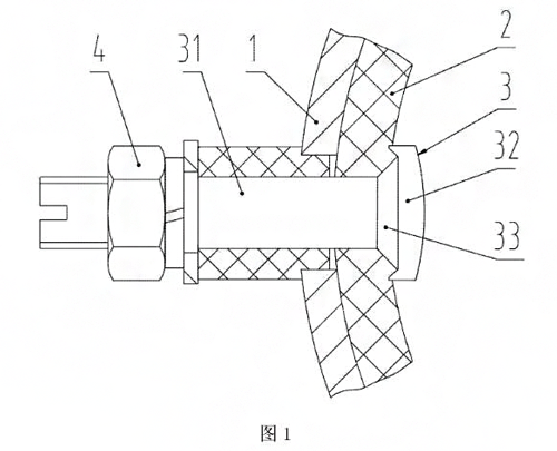 電磁流量計(jì)是利用法拉第的電磁感應(yīng)定律,即導(dǎo)電性液體在垂直于磁場(chǎng)的非磁性測(cè)量導(dǎo)電性液體在垂直于磁場(chǎng)的非磁性測(cè)量管內(nèi)流動(dòng),與流動(dòng)方向垂直的方向上會(huì)產(chǎn)生與流量成比例的感應(yīng)電勢(shì),我們根據(jù)感應(yīng)電動(dòng)勢(shì)的大小就可以知道流過的流量大小。電磁流量計(jì)電極的作用是從測(cè)量管中引出感應(yīng)電動(dòng)勢(shì),而測(cè)量的介質(zhì)可以是帶腐蝕性的各種液體,因此電極的密封和絕緣是非常重要的。參見圖4、圖5,現(xiàn)有的電磁流量計(jì)電極的安裝結(jié)構(gòu)是這樣的:其包括金屬外管1、襯里2和電極3,襯里2設(shè)置在金屬外管1中,金屬外管的管壁設(shè)有用于電極3穿過的過孔,襯里2上設(shè)有與金屬外管上的過孔同心的裝配圓孔,電極3包括電極桿31和位于電極桿一端的電極圓頭32,電極桿31和電極圓頭32成型為體,電極桿31穿過襯里的裝配圓孔和金屬外管的過孔,電極圓頭32與襯里2內(nèi)壁相接觸形成密封面。